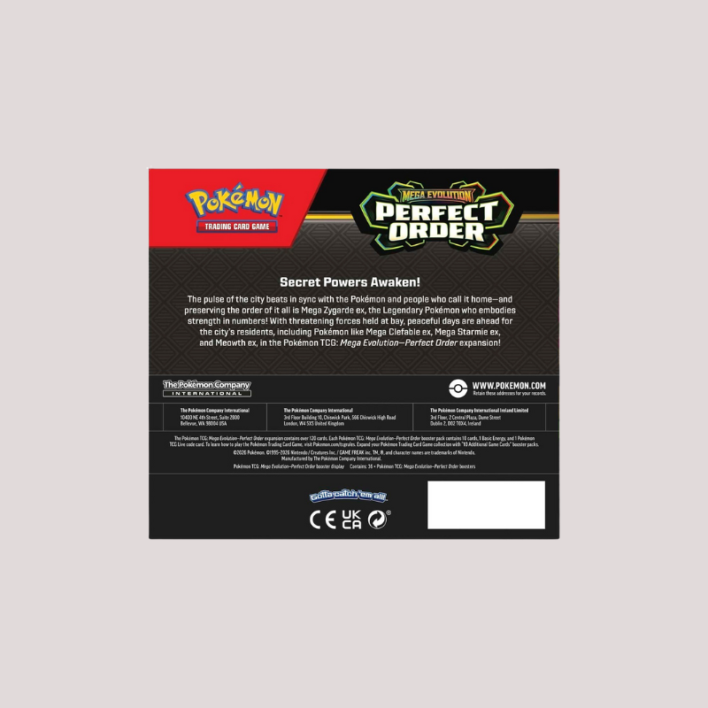 De hartslag van de Stad klopt in synchronisatie met de Pokémon en mensen die het hun thuis noemen - en het bewaren van de orde van alles is Mega Zygarde ex, de Legendarische Pokémon die kracht in aantallen belichaamt! Met dreigende krachten op afstand gehouden, liggen vredige dagen in het verschiet voor de inwoners van de stad, inclusief Pokémon zoals Mega Clefable ex, Mega Starmie ex en Meowth ex, in de Pokémon TCG: Mega Evolution - Perfect Order uitbreiding!