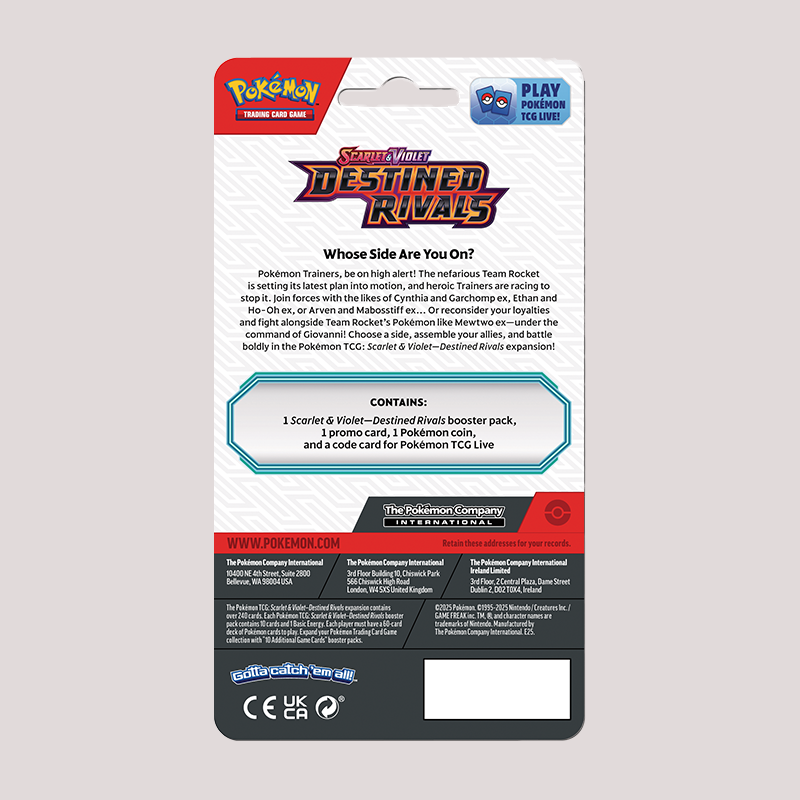 Pokémon Trainers, wees op je hoede! Het sinistere Team Rocket smeedt een nieuw plan, en dappere Trainers haasten zich om het te dwarsbomen. Sluit je aan bij Cynthia en Garchomp ex, Ethan en Ho-Oh ex, of Arven en Mabosstiff ex... Of keer je loyaliteit om en vecht aan de zijde van Team Rocket’s Pokémon zoals Mewtwo ex, onder het bevel van Giovanni! Kies je kant, verzamel je bondgenoten en ga de strijd aan in de Pokémon TCG: Scarlet & Violet—Destined Rivals uitbreiding!