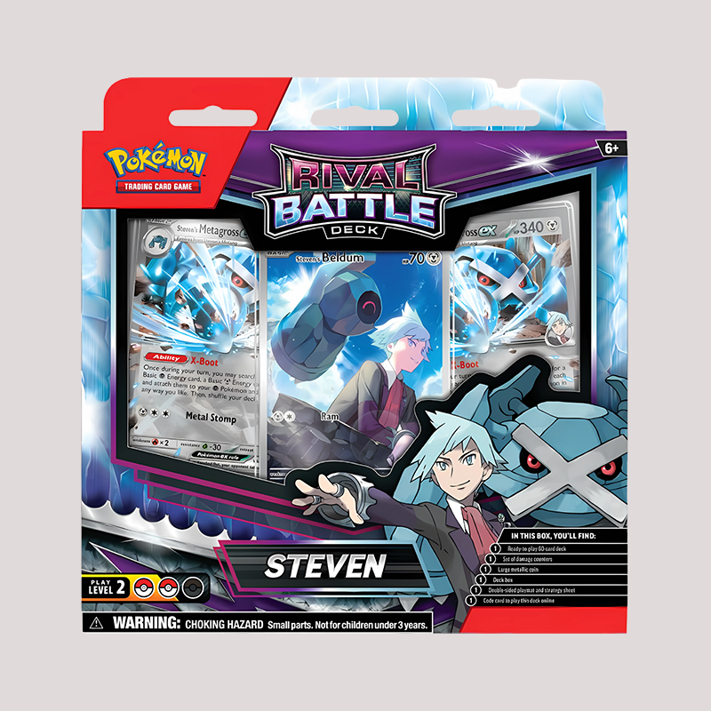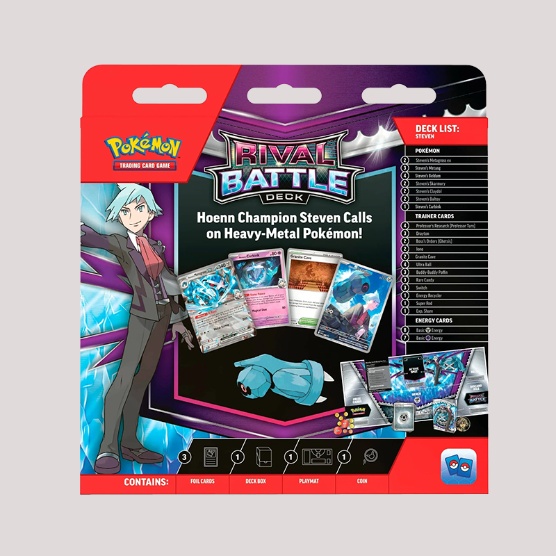 Twee nieuwe Pokémon TCG: Rival Battle Decks zijn klaar om te rommelen! Werk samen met Galar Gym Leader Marnie en haar stoere vechtende team of roepen een beroep op Hoenn-kampioen Steven en zijn Heavy-Metal Pokémon. Elk deck bevat twee krachtige Pokémon EX en alles wat je nodig hebt om meteen te spelen.