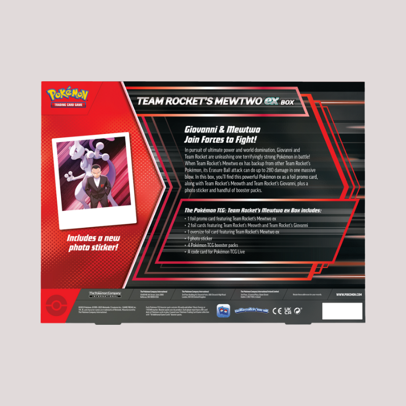 In deze box vind je deze krachtige Pokémon ex als glimmende promokaart, samen met Team Rocket’s Meowth en Team Rocket’s Giovanni, plus een fotosticker en een handvol boosterpakketen.