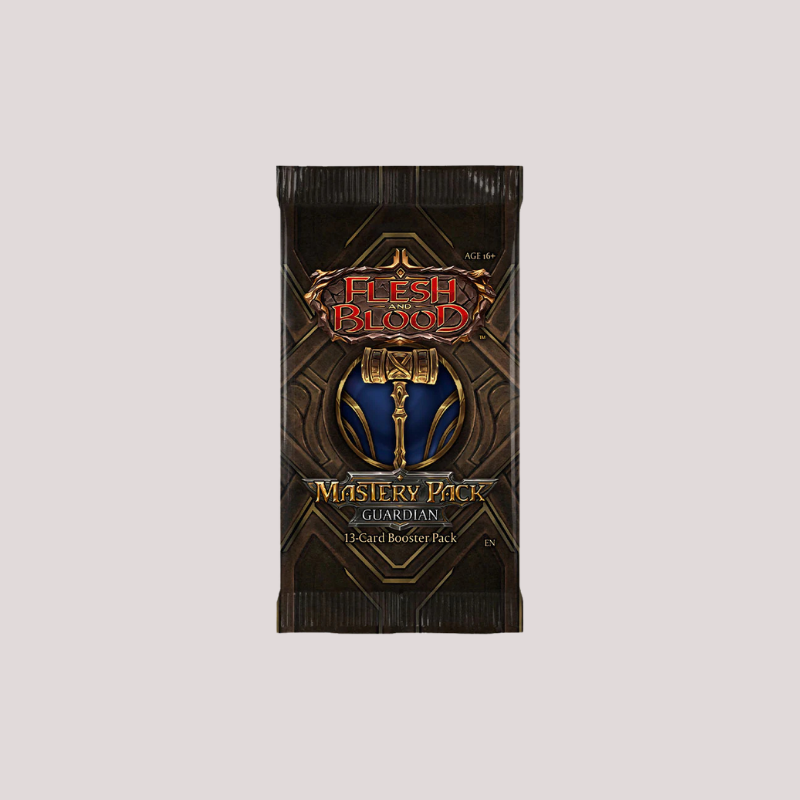 Crack, Shuffle, Play! Mastery Pack Guardian is de snelste, leukste en makkelijkste manier om Flesh and Blood te spelen. Crack 3 packs, verwijder de laatste 3 kaarten van elk pakje, schud de rest, en speel!