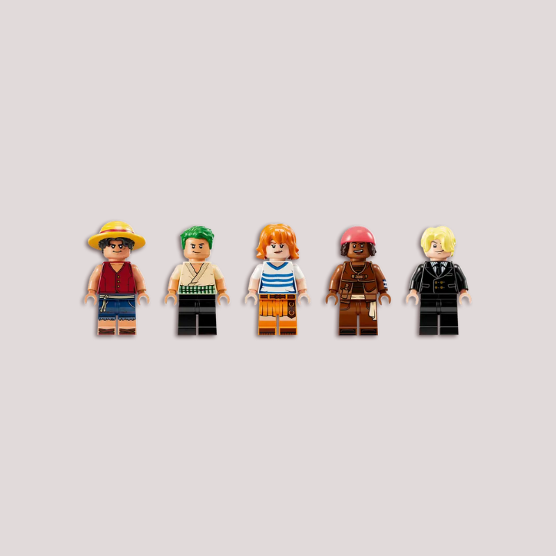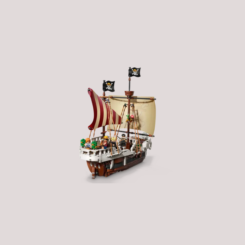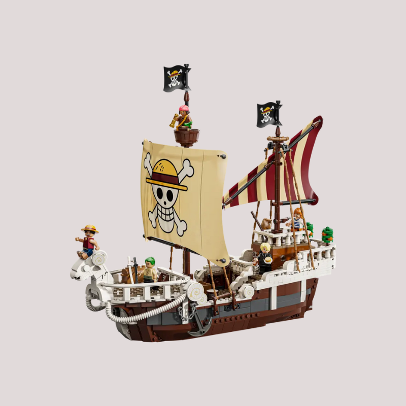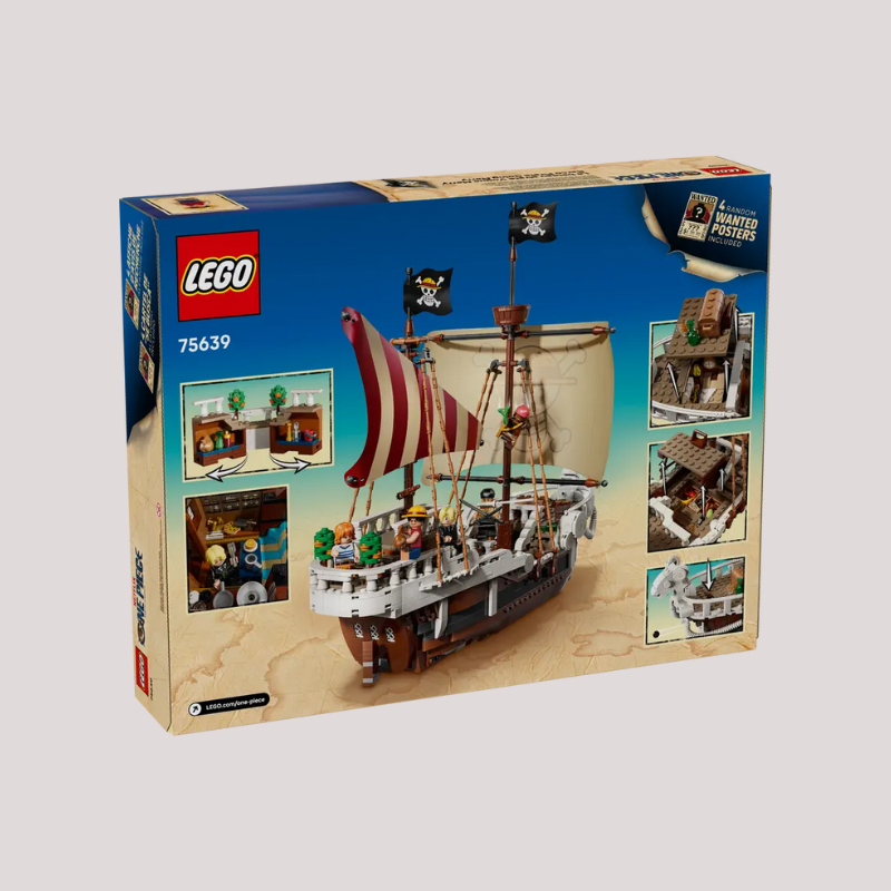 The iconic ship has several interior spaces: a crew’s cabin, kitchen, storage, and an accessory workshop. The model comes with 5 LEGO ONE PIECE minifigures. Luffy sits on the sheep figurehead at the front of the ship, below which is a cannon; Zoro relaxes and trains on the deck; Nami controls the rudder at the rear, where her favorite tangerine trees grow on the deck; Usopp climbs the masts and keeps watch from the crow's nest; and Sanji takes pots down the stairs to the kitchen. Includes 4 'Wanted' posters. The LEGO Builder app lets kids zoom in, rotate models in 3D and track progress. Set contains 1,376 pieces.