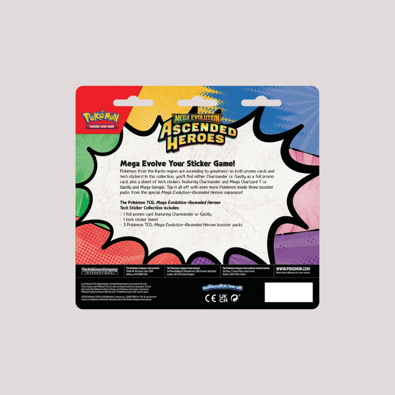Pokémon da região de Kanto estão a ascender à grandeza - com cartas promocionais e tech stickers! Nesta coleção, vais encontrar o Charmander ou o Gastly como uma carta foil promocional, e ainda uma folha de tech stickers com Charmander e Mega Charizard Y ou Gastly e Mega Gengar. E como se não bastasse, ainda traz também três booster packs do set especial Mega Evolution - Ascended Heroes!
